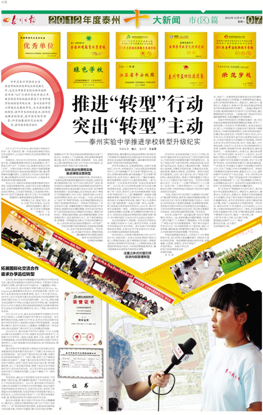 《泰州日?qǐng)?bào)》市區(qū)十大新聞評(píng)選整版報(bào)道我校轉(zhuǎn)型升級(jí)、創(chuàng)新教育成就