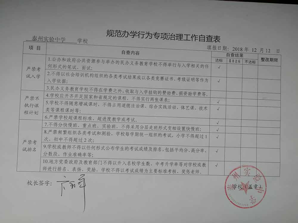 泰州實驗中學規(guī)范辦學行為專項治理工作自查表