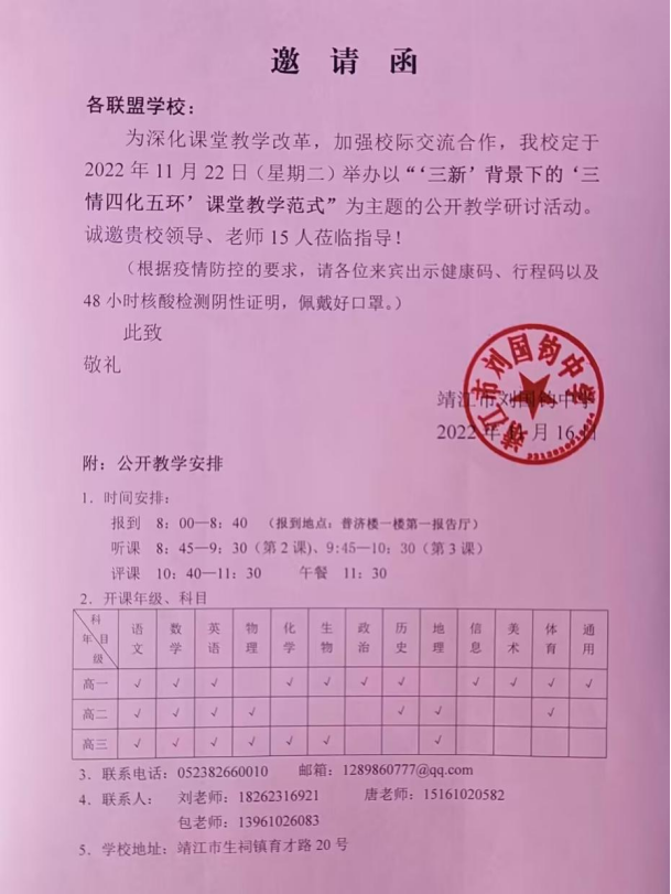 2022年11月22日,應(yīng)靖江市劉國(guó)鈞中學(xué)誠(chéng)摯邀請(qǐng),我校骨干教師一行15人,在卞玉年校長(zhǎng)的帶領(lǐng)下,赴劉國(guó)鈞中學(xué)開展研學(xué)交流活動(dòng)。在現(xiàn)場(chǎng)觀摩課堂教學(xué)、學(xué)習(xí)常規(guī)管理、聽取專題報(bào)告、交流討論后,大家深覺對(duì)外交流對(duì)開拓我校辦學(xué)新思路,具有深遠(yuǎn)的意義。我校將積極推進(jìn)師生對(duì)外交流,力爭(zhēng)讓學(xué)校再上一個(gè)臺(tái)階。