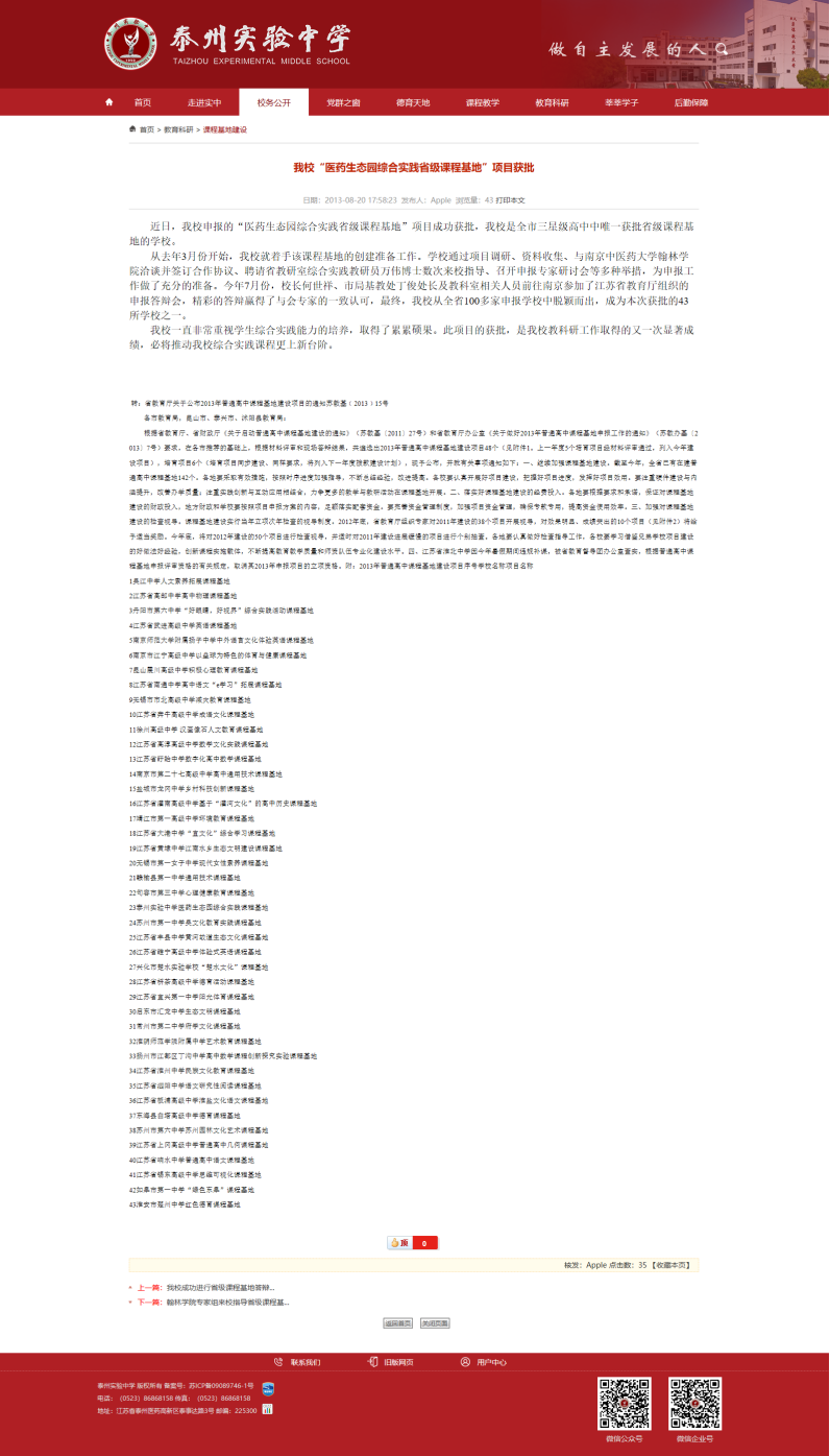五是一定范圍內(nèi)產(chǎn)生了積極影響,形成了學(xué)校特色。王學(xué)鋒副市長及市教育局領(lǐng)導(dǎo)等曾來校察看中草藥種植和課程基地建設(shè)工作,并為建設(shè)骨干教師隊(duì)伍作專門批示;《泰州晚報(bào)》、泰州教育網(wǎng)等多家媒體也多次報(bào)道課程基地建設(shè)情況。