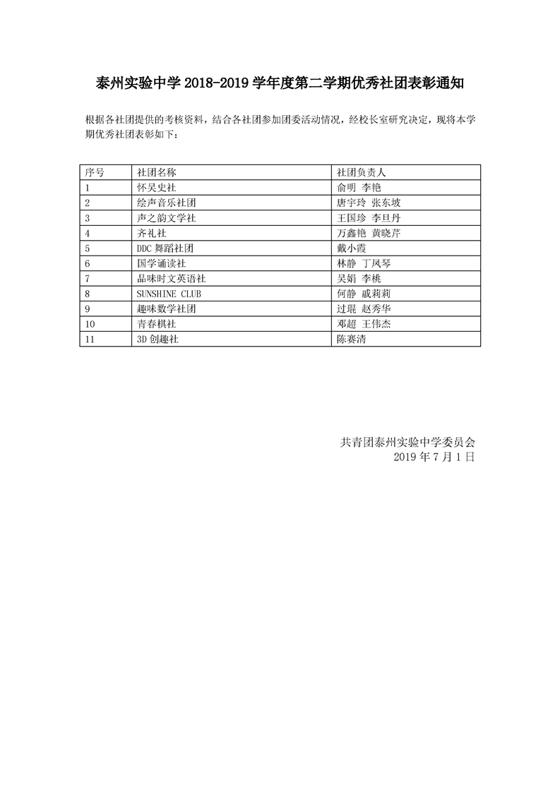 泰州實驗中學 2018-2019 學年度第二學期優(yōu)秀社團表彰通知