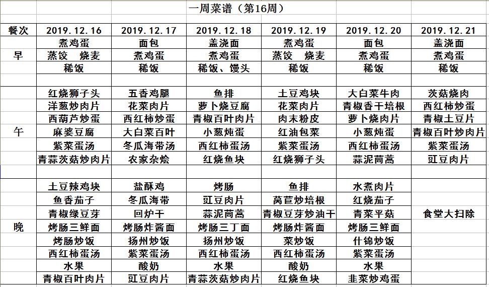 19年秋學期第16周菜譜