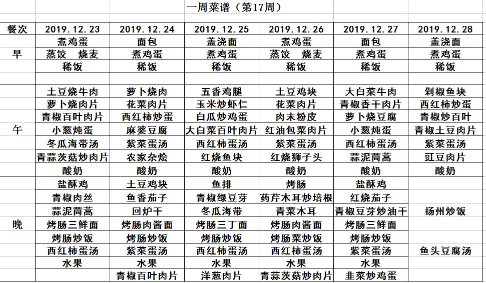 19年秋學(xué)期第17周菜譜