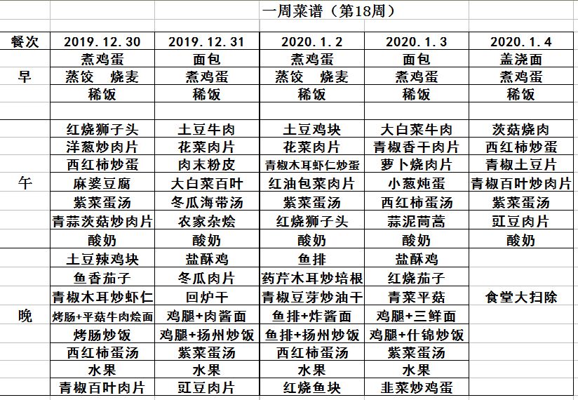 19年秋學(xué)期第18周菜譜