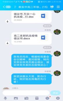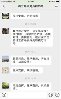 會(huì)后,各個(gè)支部立即響應(yīng),向支部全體黨員發(fā)出的倡議。倡議全體黨員:要提高政治站位,自覺擔(dān)當(dāng);要盡責(zé)履職,自覺正面引領(lǐng);要主動(dòng)作為,精心備課上課,確保學(xué)生停課不停學(xué)。用實(shí)際行動(dòng)展現(xiàn)共產(chǎn)黨員的精神風(fēng)范。全校黨員通過微信接力積極承諾,表示要以科學(xué)的態(tài)度認(rèn)識(shí)疫情、應(yīng)對(duì)疫情,在疫情面前主動(dòng)擔(dān)當(dāng)作為,盡職盡責(zé),從自身做起,自覺踐行防控要求,發(fā)揮帶頭作用!