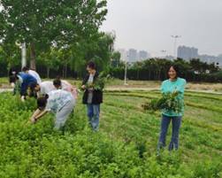 學(xué)生來到我校種植園,尋找艾草種植地,對雜草和艾草進行辨別。