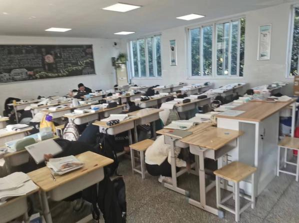 上午9:10,一陣急促的警報鈴聲響徹校園,所有正在上課的教師隨即停止授課,班主任指導(dǎo)學(xué)生按照防震避災(zāi)的要求立即護住頭部,迅速蹲到課桌底下保護自己,同時等待時機離開教室。
